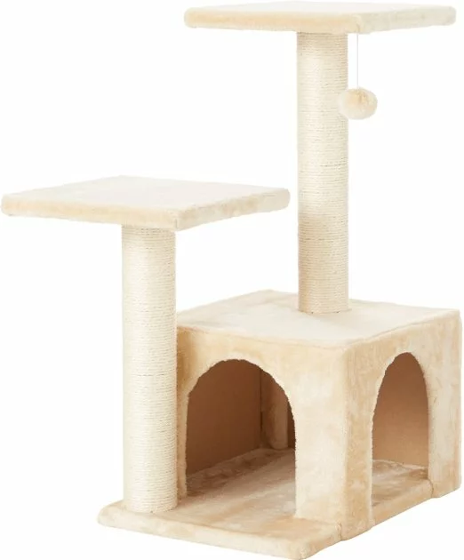 The Frisco 28-Inch Cat Tree is just the right size for energetic kittens and smaller cats without taking up too much precious floor space. It’s got everything a cat could want in his very own cat tree—places to hunt, jump, stand guard, snooze and scratch as much as he wants. There are two perches of different heights so your mini lion can jump from one to the other or just rest on top and keep watch of his living room kingdom. They’re supported by two sisal-wrapped scratching posts that are made just for clawing. A soft, plush material covers the base, perches and the cozy apartment that doubles as a hiding spot and a quiet lair for napping. When it’s time to prowl, your cat can experience the thrill of the hunt by stalking and batting at the toy hanging down from the top perch. Even if you live in an apartment or small home, the Frisco 28-inch cat tree becomes your furry friend’s own personal jungle gym so he can get the exercise he needs. This cat tree is easy to assemble with the included tools and step-by-step instructions.