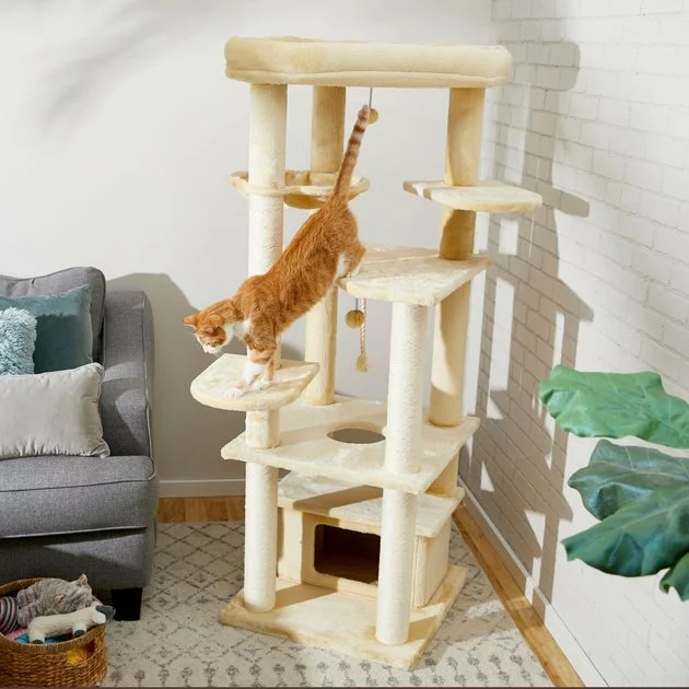 Give your cat some extra loving with the Frisco 65-Inch XXL Heavy Duty Cat Tree. From the spacious condo to roomy landing spaces and even the extra large perch bed at the top, your kitty will have no problem sprawling and stretching to their furry heart’s content. There’s even a basket hammock for your cat to hang out in. When they wake up from their cat nap ready for a scratching session, the sisal posts can help promote stimulation and healthy nails. This heavy-duty cat tree stands up to heavy-duty playtime and includes a rope toy and hanging ball toys for hours of furry fun.