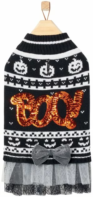 Sweater on top, dress on bottom. The Frisco “Boo!” Dog & Cat Sweater Dress brings the best of both worlds to your pet’s spooky season wardrobe! If your boo needs a Halloween-inspired look for a party, photo op or a trick-or-treat trot, look no further. This sweater-dress combo features a sequined “Boo!” graphic with a cobweb tulle skirt and a tulle bow accent. Plus, it’s a pullover-style piece, so it fits over their head easily and helps keep them comfy while they’re looking cute. However you celebrate Halloween with your best friend, this sweater-dress combo is the perfect way for them to show their spirit!