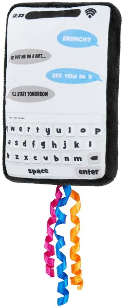 - Cellphone plush cat toy includes catnip to boost playtime and get kitty moving.