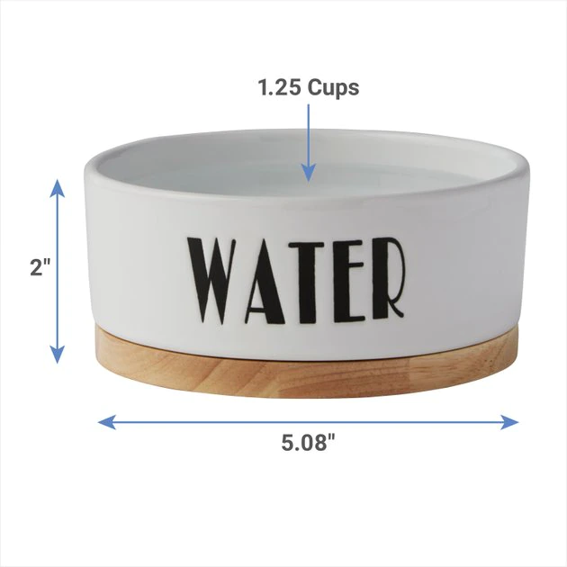 - Simple, white ceramic pet bowl with modern, black “water” graphic on the side.