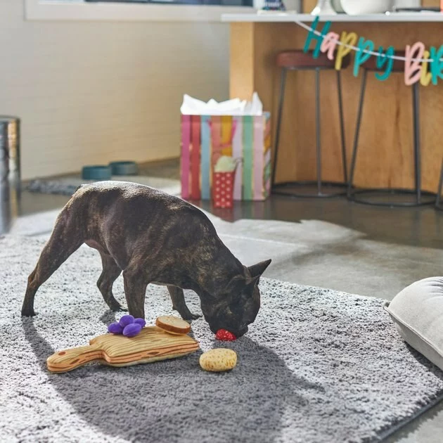Charcuterie for your cutie? Surprise your bestie with this plush interactive charcuterie board toy. It features a plush, squeaky board with removable salami, cheese, crackers and grapes. Each removable toy has a built-in squeaker to get your pup extra excited. This squeaky snack spread is a playtime must-have!