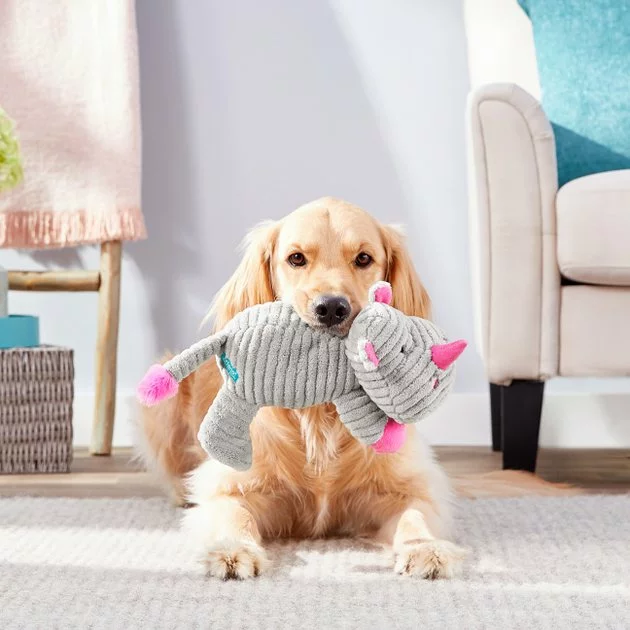 What a cuddly, squeaky cutie! Get playtime started with the Frisco Corduroy Plush Squeaking Rhino Dog Toy. It has built-in squeakers for the loud fun dogs love, and crinkle paper perfectly placed for added excitement. Made with an ultra-soft plush material with a cuddly corduroy texture, it’s also perfect for nap time.