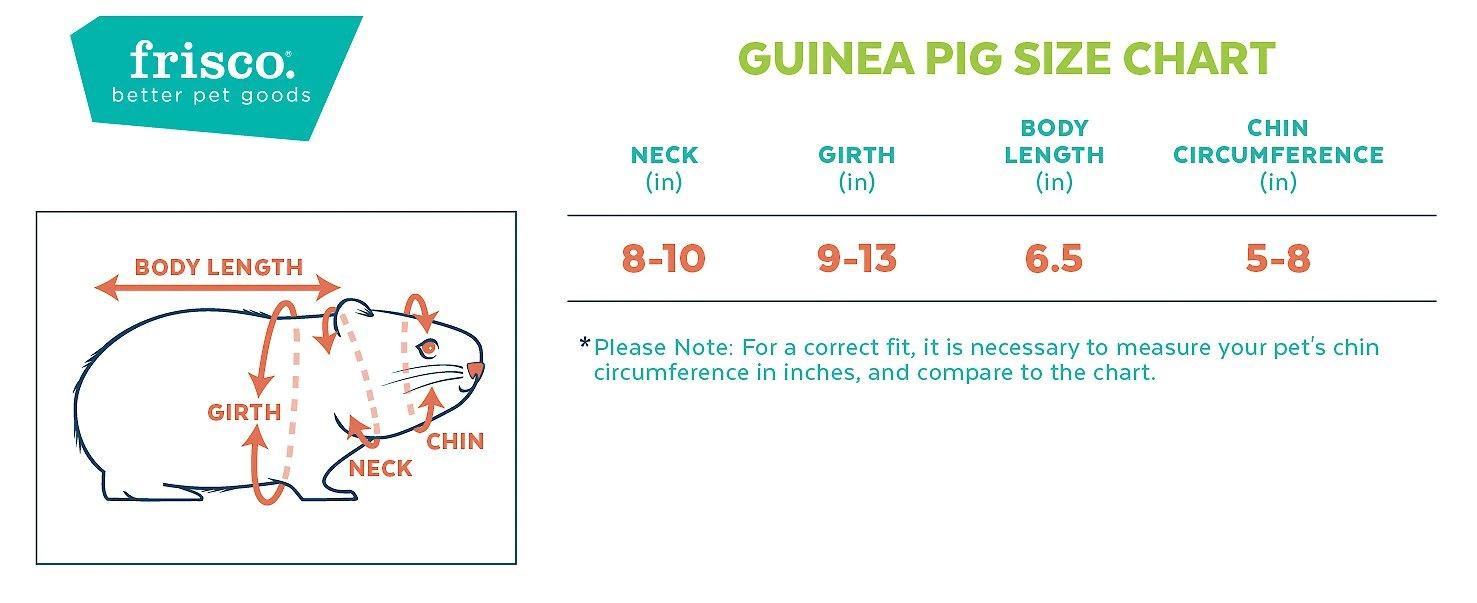 | One Size | 8 – 10 Inches | 9 – 13 Inches | 6.5 Inches | 5 – 8 Inches | Guinea Pig |