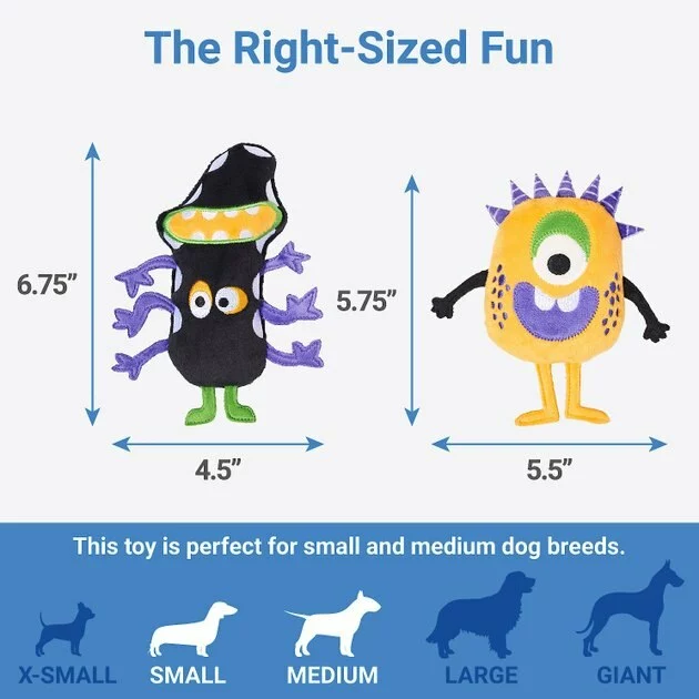 - Each friendly monster has a squeaker inside to get your pup’s attention and keep playtime going.