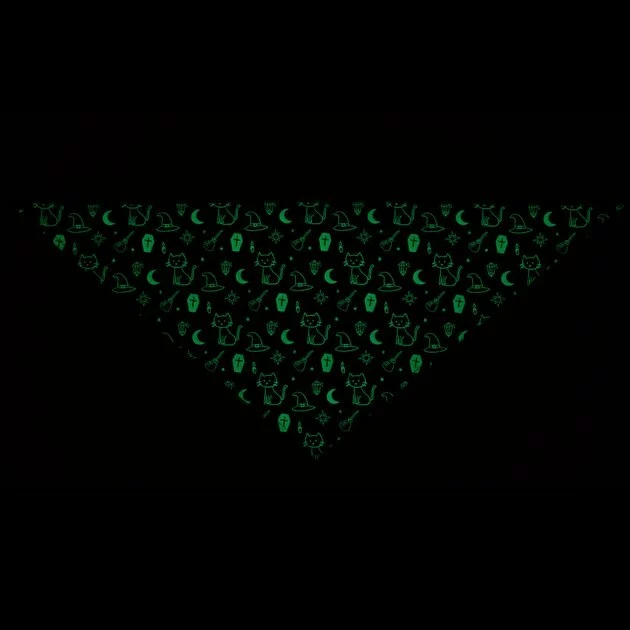 Wanna show your pet’s spooky spirit without dressing them up in a full costume? Try a casual look with a simple bandana that’s just about as cute as your best friend! With cats, witch hats and moons that glow in the dark, it’s got just the right Halloween touches for parties, photo ops and trick-or-treat outings in the neighborhood. Plus, it’s easy to put on, and comfy too. Just fold it, roll it to the right length for your pet, and tie it loosely around their neck.