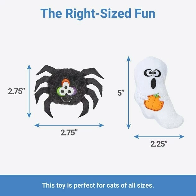 Give your kitty a Halloween treat with this duo of classic Halloween characters to get them in the spirit! This two-pack includes a ghost toy (holding a cute little pumpkin) and a big, bug-eyed spider toy that team up to bring your cat twice the fun when it’s time to play. They’re covered with claw-friendly fabric, plush-stuffed and infused with exciting catnip to make play seem irresistible. With this terrific twosome, your cat will be on the prowl for fun all through the Halloween season!