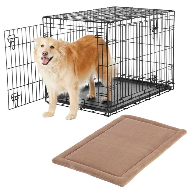 Frisco Heavy Duty Fold & Carry Double Door Collapsible Wire Dog Crate & Frisco Micro Terry Dog Crate Mat, Taupe