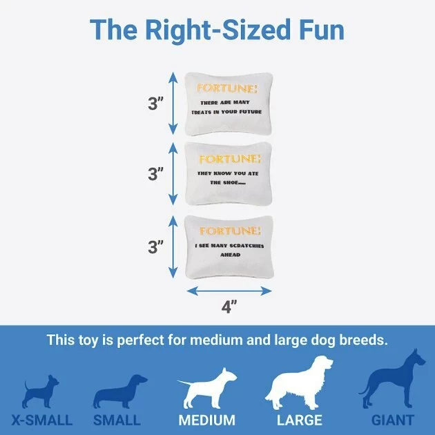 - Plush puzzle toy comes with soft fortune teller’s booth and three squeaky fortunes to retrieve.