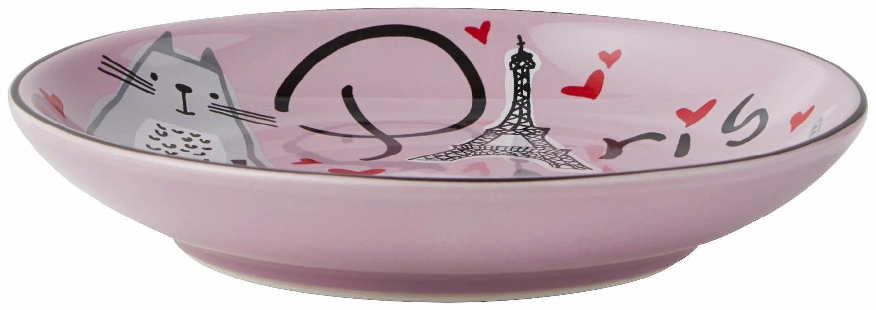 - Soft purple ceramic cat dish with a distinctive Paris-themed design inside.
