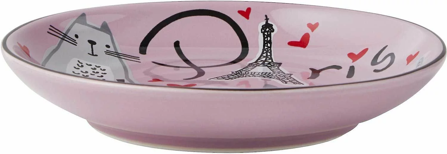 - The Frisco Paris Non-skid Ceramic Cat Dish is crafted with a distinctive Paris-themed design outside and “kiss me” graphic inside.