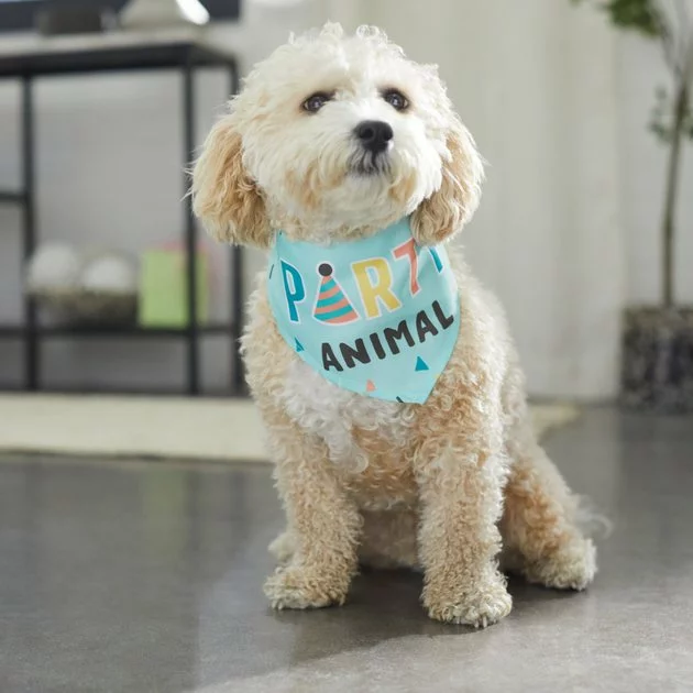 - Doggy bandana comes in a blue base and reads “Party Animal,” so everyone will know who the life of the party is.
