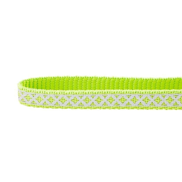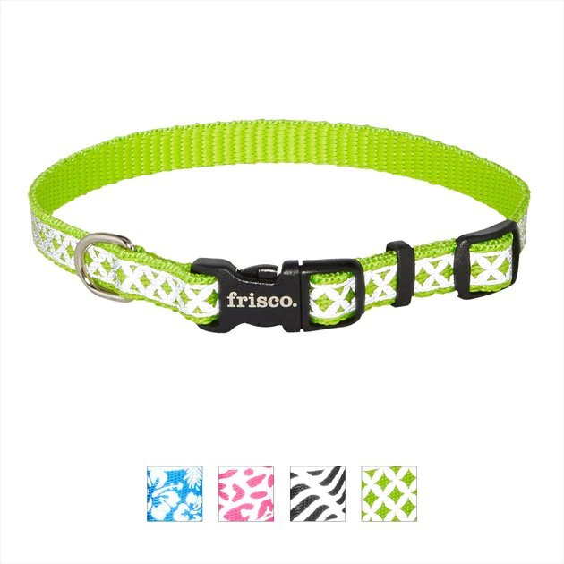 The Frisco Patterned Polyester Reflective Dog Collar collection feature stylish, reflective patterns to make sure your pooch is the hippest pup on the block, day or night. The reflective patterns aren’t just fashion- paw-ward, but are designed to reflect ambient light for added safety in low-light conditions. Nighttime outings? Check. These collars are built to brighten up any walk—literally—by reflecting light from the environment. And they’re made to last with high-quality, polyester webbing that uses an Ultra-Weld™ seal that’s been lab-tested to withstand up to seven times the maximum recommended weight for each size. This collar also features sleek, nickel-coated hardware, and the plastic buckle has curved edges for your dog’s comfort. Most sizes also feature an ID ring for attaching ID tags without cluttering the collar. Plus, there’s a matching Frisco Reflective Leash that goes with each collar style!