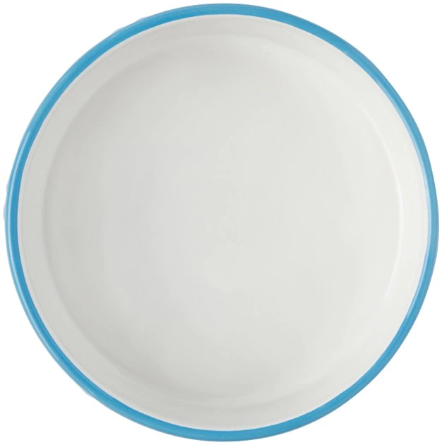 - Bright blue ceramic pet bowl with embossed paw prints around the outside.