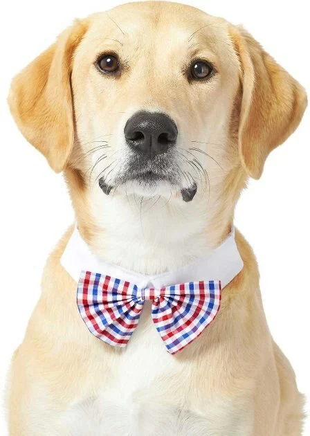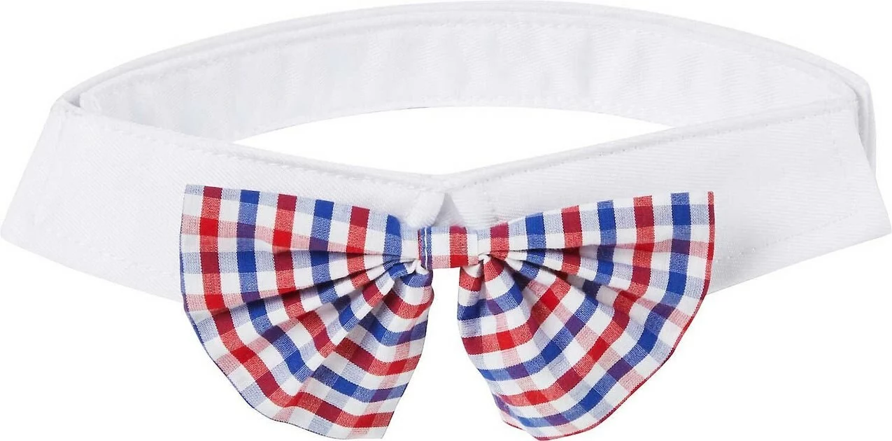 Get your pup or kitty ready to make a fashion statement with the Frisco Plaid Dog & Cat Bow Tie bundle. The plaid print bow tie is available in two different color patterns: red & blue and orange & blue. With a realistic white collar, these bow ties give your pet adorable dapper vibes. The bow ties are equipped with wide fasteners for added adjustability and come in two sizes. It goes on with a hook-and-loop fastener around your pal’s neck for that polished look, perfect for special events and themed photos.