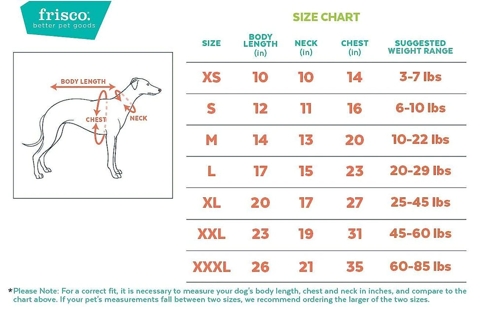 | Size | Body Length | Neck | Chest | Suggested Weight Range | Suggested Breed Size |