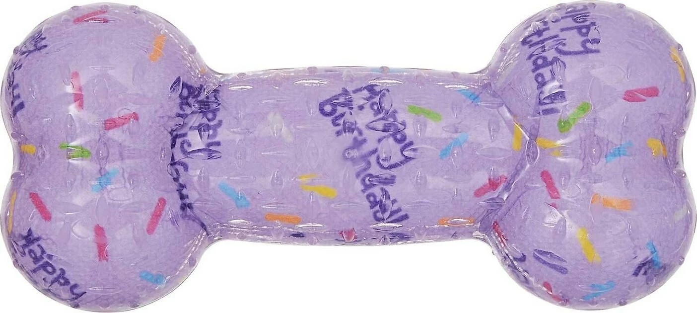 Throw your furry friend a birthday paw-ty with this fun and tasty bundle! It includes the Frisco Birthday TPR Bone Dog Toy and The Lazy Dog Cookie Co. Happy Birthday Pup-PIE Dog Treat! Get the party started with the bounce-tastic Frisco bone. Toss it, squeak it, bounce it! It’s made with thermoplastic rubber for the erratic bounce dogs are all about, and a built-in squeaker to turn up the fun. The squeaker is hidden inside the toy to keep it away from overexcited teeth if the toy gets punctured. It’s also suitable for everyday play and made with non-toxic materials. After your birthday buddy is done playing, reward her with the Pup-PIE Dog Treat! This unique treat is made with simple ingredients that are amazingly delicious and naturally nutritious. And because the compassion for all animals run deep at The Lazy Dog Cookie Co., all of their products are vegetarian and vegan. When it comes right down to it, they’re just plain good, wholesome treats that you can feel good about giving your dog—and your dog will feel even better about being on the receiving end of them.