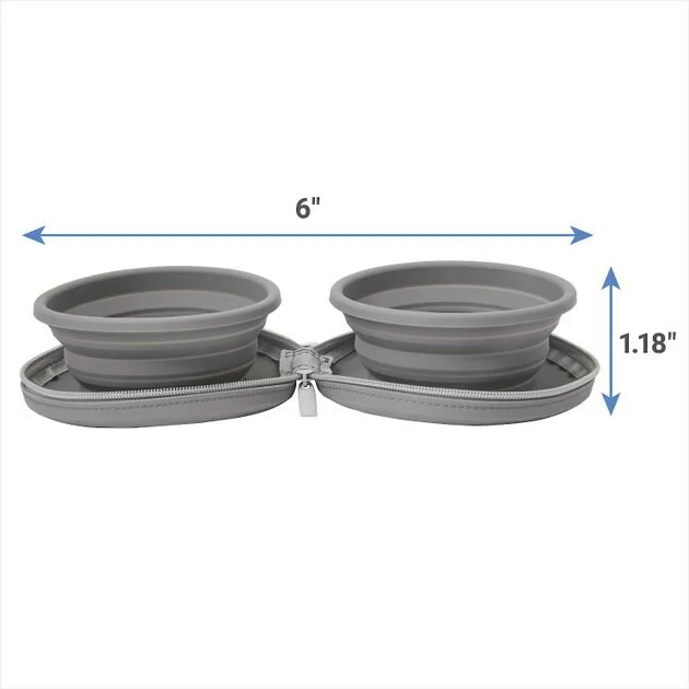 - One set of two collapsible travel bowls that fold up and zipper shut.