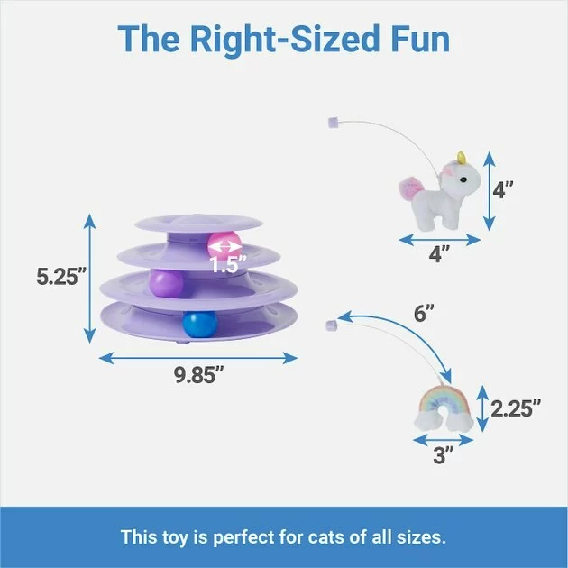 - Includes three-tier track, three colorful balls, and unicorn and rainbow pieces that include catnip inside.