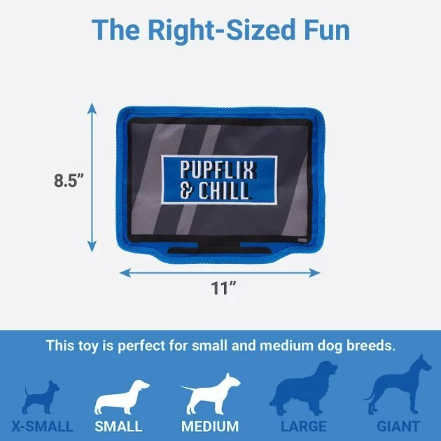 - TV screen toy with flat screen design on one side and funny definition of “Pupflix” on the other.